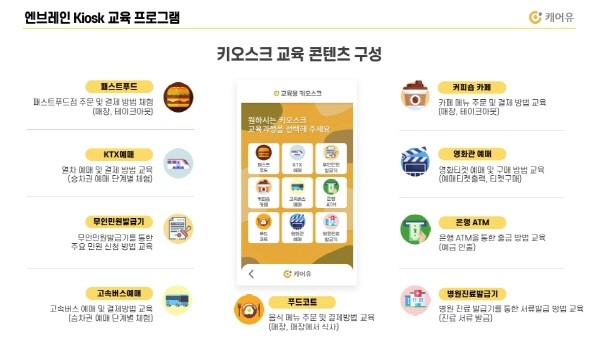 엔브레인은 상황, 장소별 맞춤 체험 및 교육이 가능한 제품으로, 키오스크 활용도가 높은 9곳(패스트푸드점, KTX 예매, 무인민원발급기, 고속버스 예매, 푸드코트, 커피숍, 영화관, 은행 ATM, 병원 진료 발급기)을 실제와 유사하게 구성했다. 사용자가 직접 상황별 체험을 통해 학습하고 교육용 모의 카드로 실제 결제 방식과 동일하게 주문을 한 뒤 영수증 용지를 직접 출력해볼 수 있다.